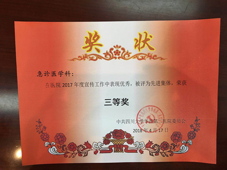 随后的颁奖仪式将会议推至高潮,大家纷纷拍照记录下这激动人心的时刻。急诊科因在医院2017年度宣传工作中表现优秀,被评为先进集体,荣获“三等奖”。急诊人在2018年将继续齐心协力、脚踏实地、精益求精做好宣传工作。(供稿:侯燕、黄蓓;供图:侯燕、潘玲丽)