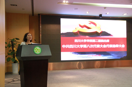 党委王素霞书记首先指出本次党员代表大会的主要任务是选举我院出席四川大学第八次党代会的代表候选人,报告应到会109人,实际到会人数107人,宣布大会有效。王素霞书记宣读党代会代表选举办法、总监票人、监票小组名单,详细说明了党代表候选人预备人选的酝酿和提名经过,并提请大会审议通过选举办法、总监票人、监票小组名单和党代表候选人预备人选名单。