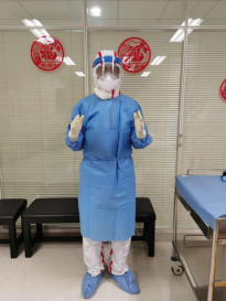 同时,在出发前,在科室管理小组指导下,还作为模特利用休息时间演练操作、拍摄视频及图片等,协助科室制定工作人员防护服规范穿脱流程,全身湿透毫无怨言。