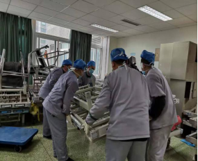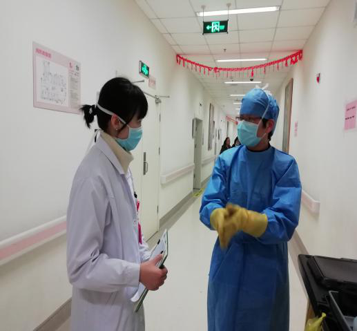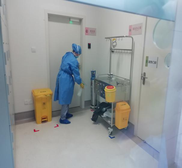 根据医院统一部署:将南九楼作为临时手术及分娩隔离区。接到通知后我们立即组织员工连续加班5天,搬迁出原南九楼的各类物资、设施设备,彻底对环境、物表、空气进行清洁和消毒,“抢”出一个临时隔离区域,用于收治疑似患者。