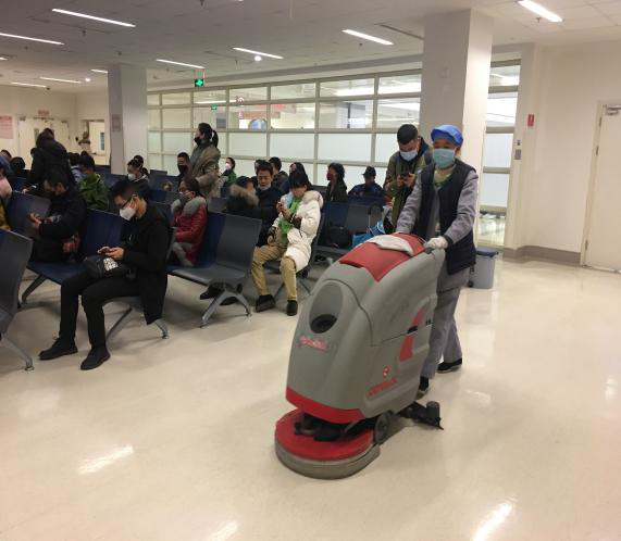 配药、兑水、封盖,医疗运行保障办公室负责场所消杀的老师早已将消杀流程烂熟于胸,左手紧握手柄,右手加压,对着急诊入院通道的路面来回喷洒,消杀结束,老师们还不忘在通道边上立起一块“小心地滑”的指示牌。自助报告打印机、取款机、开水房、取药台这些容易忽视的消毒区域也是消杀的重点,先喷后抹,虽然程序繁琐也绝不马虎。针对此次疫情病毒通过飞沫传播的特点,后勤部门对医院中央空调系统和负压系统进行一次全方位的清洁和消毒。
