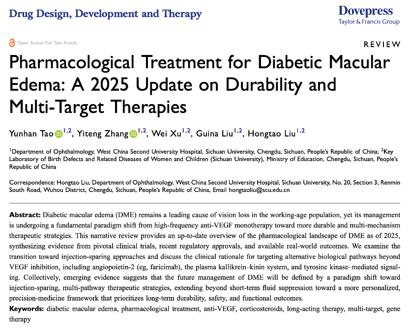 近期,四川大学华西第二医院眼科团队在国际知名期刊《Drug Design, Development and Therapy》上发表了题为《糖尿病黄斑水肿的药物治疗:2025年关于疗效持久性与多靶点疗法的更新》的综述文章。该文章系统梳理了糖尿病黄斑水肿(DME)治疗领域的最新进展,为临床实践提供了前沿的学术参考。据了解,目前该文章已被国际权威数据库Web of Science收录。